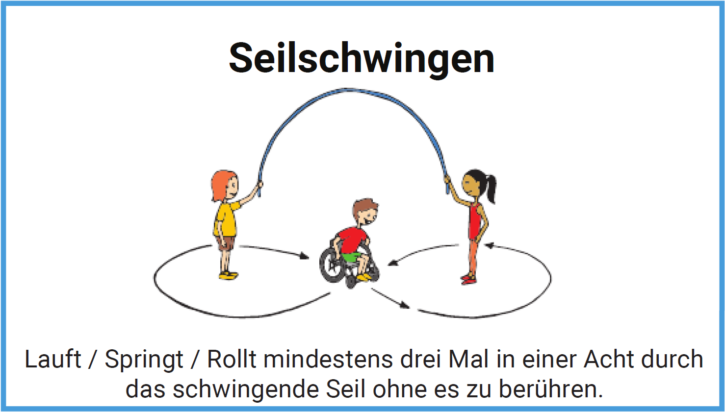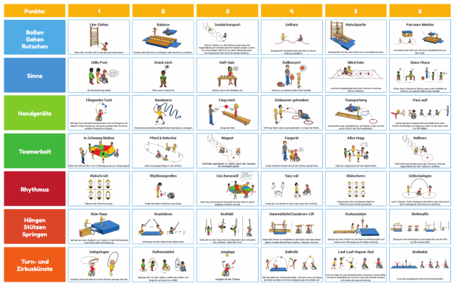 • Kraft und Beweglichkeit sowie Turnerische Grundelemente wie Vorwärtsrolle, Rückwärtsrolle, Rad
