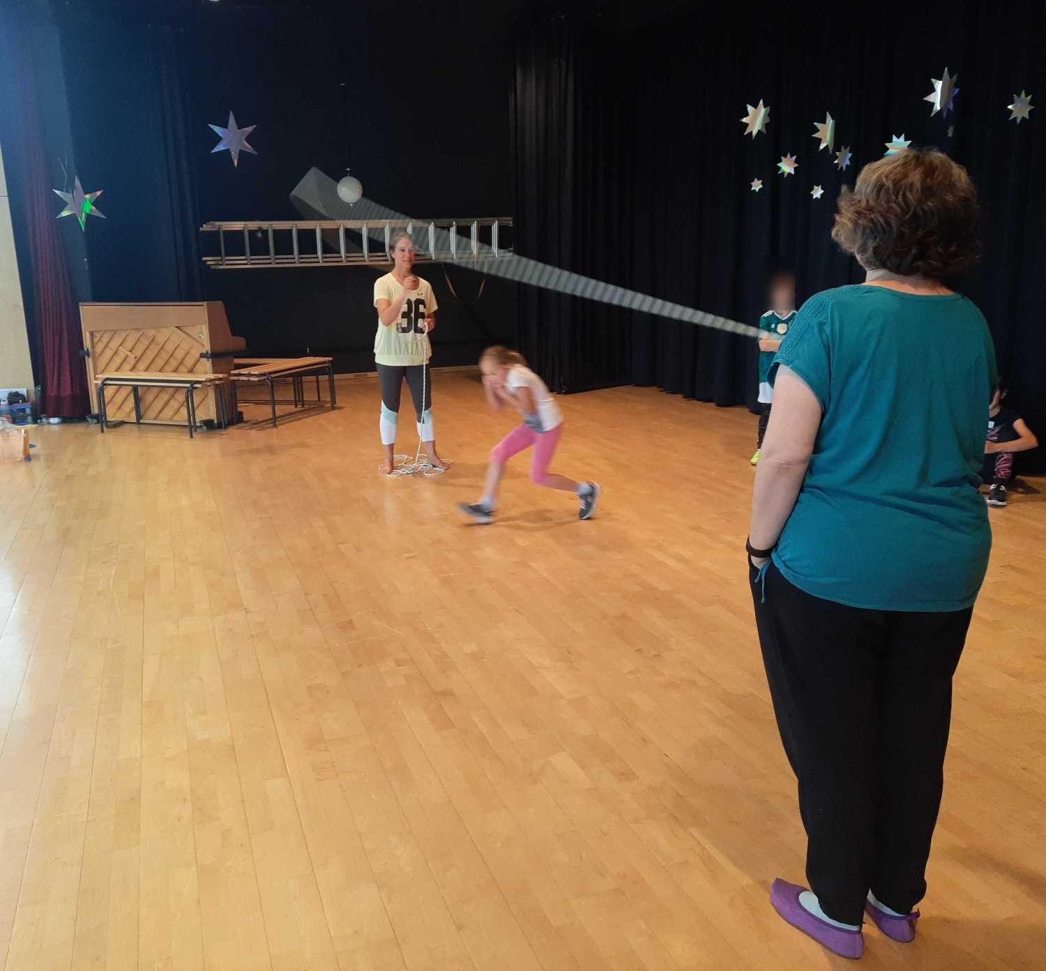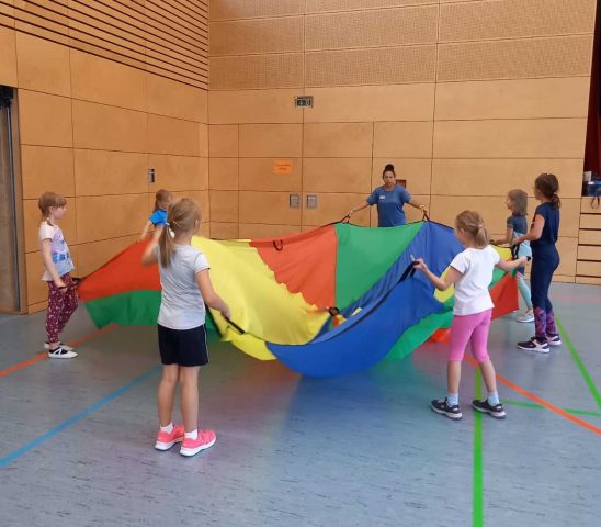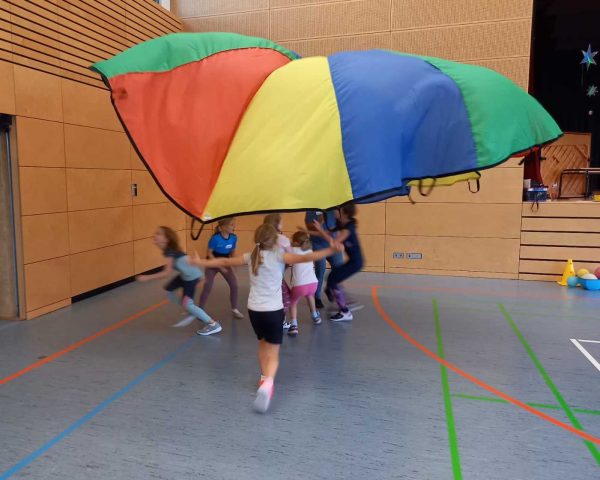 Mit Begeisterung und vollem Einsatz wurden die verschiedenen Stationen durchlaufen – darunter Highlights wie „Kranfahren“, „Seilschwingen“ oder das „Faxgerät“. Auch unser neues Schwungtuch kam zum Einsatz, wie man auf den Bildern sehen kann.